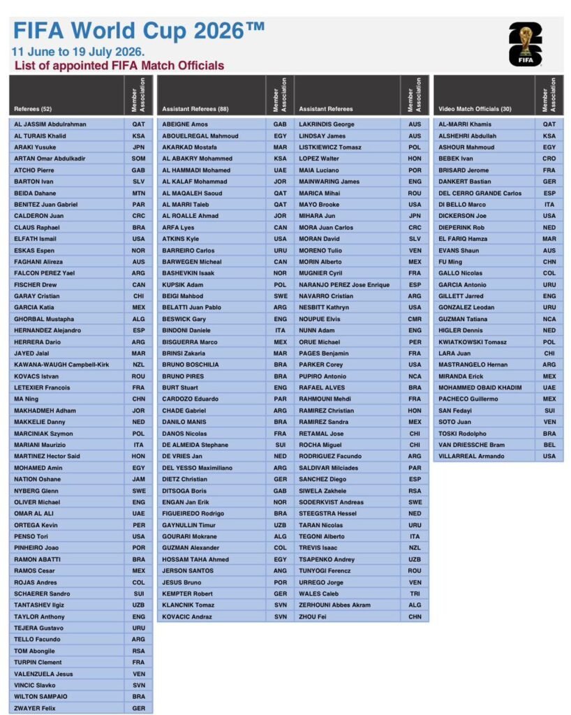 أعلن الاتحاد الدولي لكرة القدم (فيفا) القائمة المختارة من الحكام للمشاركة في إدارة مباريات كأس العالم 2026 التي تستضيفها الولايات المتحدة الأمريكية بمشاركة كلا من كندا والمكسيك، و تتكون القائمة من 52 حَكماً و88 حَكماً مساعداً و30 من حُكام الفيديو ممثلين جميع الاتحادات القارية الستة، ومن 54 اتحاداً وطنياً بينهم الاتحاد المصري لكرة القدم الذي يمثله أربعة حكام في البطولةوهم أمين محمد عمر “حكم ساحة”ومحمود أبو الرجال و أحمد حسام فتحي”مساعدين” ومحمود عاشور”حكم الفيديو” وتعد هذه المرة الأولى التي يشارك فيها طاقم تحكيم مصري بالكامل في إدارة مباريات كأس العالم، كما يشارك في إدارة المباريات 17 حكمًا عربيًا.