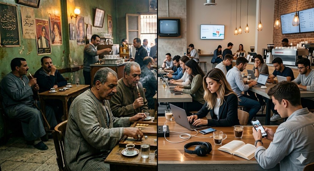 هذا التحول الكبير لم يأتِ من فراغ، بل ارتبط بتغير أنماط الحياة نفسها، فمع انتشار العمل الحر والعمل عن بُعد، تحولت المقاهي إلى مساحات عمل غير رسمية، فلم يعد الهدف من الذهاب إلى المقهى هو الترفيه فقط، بل أصبح أيضا إنجاز المهام، أو حضور الاجتماعات الافتراضية، أو حتى الدراسة، وهنا لم تعد جودة القهوة وحدها هي العامل الأساسي، بل أصبحت سرعة الإنترنت، وهدوء المكان، وتوافر المقابس الكهربائية عناصر لا تقل أهمية، ورغم أن هذا التغيير منح المقاهي دورا جديدا، إلا أنه أثر بشكل واضح على طبيعة العلاقات داخلها، وظهر ما يُعرف اليوم بـ”العزلة الجماعية” التي أصبحت سمة بارزة، حيث يجلس الأفراد في نفس المكان، لكن دون تفاعل حقيقي.