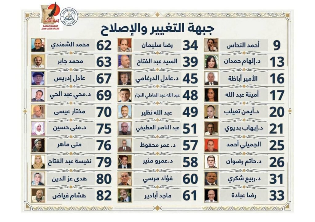 كما تدخل المنافسة قائمة ثالثة تحت اسم “جبهة التغيير والإصلاح”، والتي تضم عددًا من الأسماء، من بينهم: