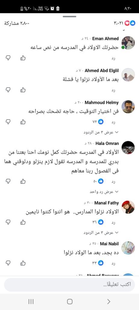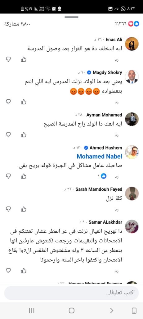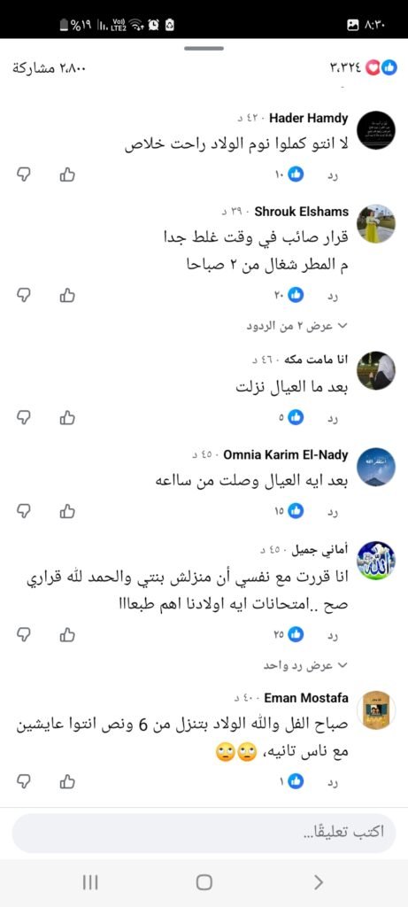 وجاءت أبرز التعليقات ساخرة وحادة، حيث كتب أحد أولياء الأمور: “كملوا نوم وشدوا اللحاف.. الولاد وصلوا المدرسة”، في إشارة إلى غياب التقدير لحالة الطقس قبل اتخاذ القرار، بينما تساءل آخرون عن أسباب عدم التنسيق المسبق أو الاستعداد لمثل هذه الظروف الجوية التي تم التحذير منها مسبقًا.