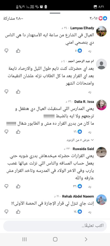 وتداول أولياء الأمور عبر مواقع التواصل الاجتماعي مئات التعليقات الغاضبة، منتقدين تأخر اتخاذ القرار، الذي جاء -بحسب وصفهم- “بعد فوات الأوان”، حيث كان عدد كبير من الطلاب قد غادروا منازلهم بالفعل في ظل طقس سيئ وأمطار كثيفة، ما عرضهم لمشقة ومخاطر كبيرة.