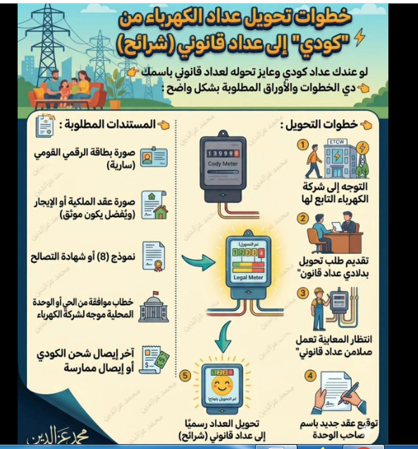 وبخصوص خطوات تحويل العداد، تمثلت في التوجه إلى شركة الكهرباء التابع لها، وتقديم طلب “تحويل من عداد كودي إلى عداد قانوني”، وانتظار المعاينة الفنية للتأكد من سلامة التوصيلات، وتوقيع عقد جديد باسم صاحب الوحدة، وفي الختام تحويل العداد رسميًا إلى عداد قانوني”شرعي”.