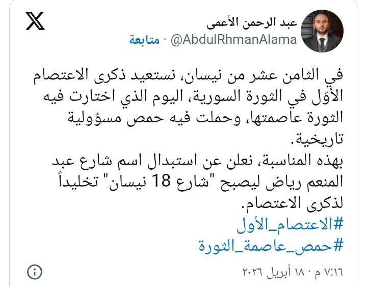 وأوضح محافظ حمص، عبد الرحمن الأعمى، في منشور له عبر منصة “إكس”، أن إطلاق اسم “18 نيسان” على الشارع يأتي في إطار إحياء ذكرى أول اعتصام شهدته ساحة الساعة بمدينة حمص عام 2011، والذي يُنظر إليه كأحد أبرز اللحظات المفصلية في بدايات الحراك السوري، وأشار إلى أن هذا التاريخ يحمل رمزية خاصة، باعتباره اليوم الذي اختارت فيه الثورة ما وصفه بـ”عاصمتها”، في إشارة إلى مكانة حمص في تلك المرحلة.