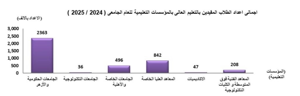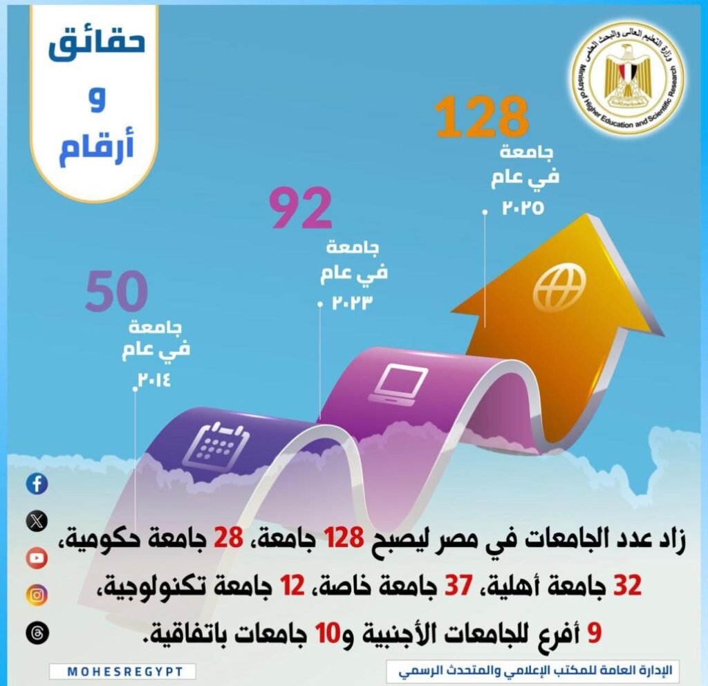 وفقا لنشرة سلسلة “حقائق وأرقام” التي تطلقها وزارة التعليم العالي والبحث العلمي للتعريف بمؤشرات منظومة التعليم العالي في مصر عدد الجامعات: