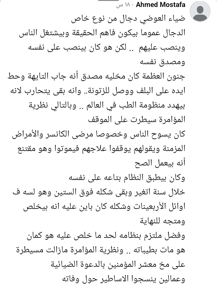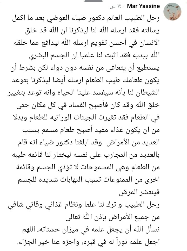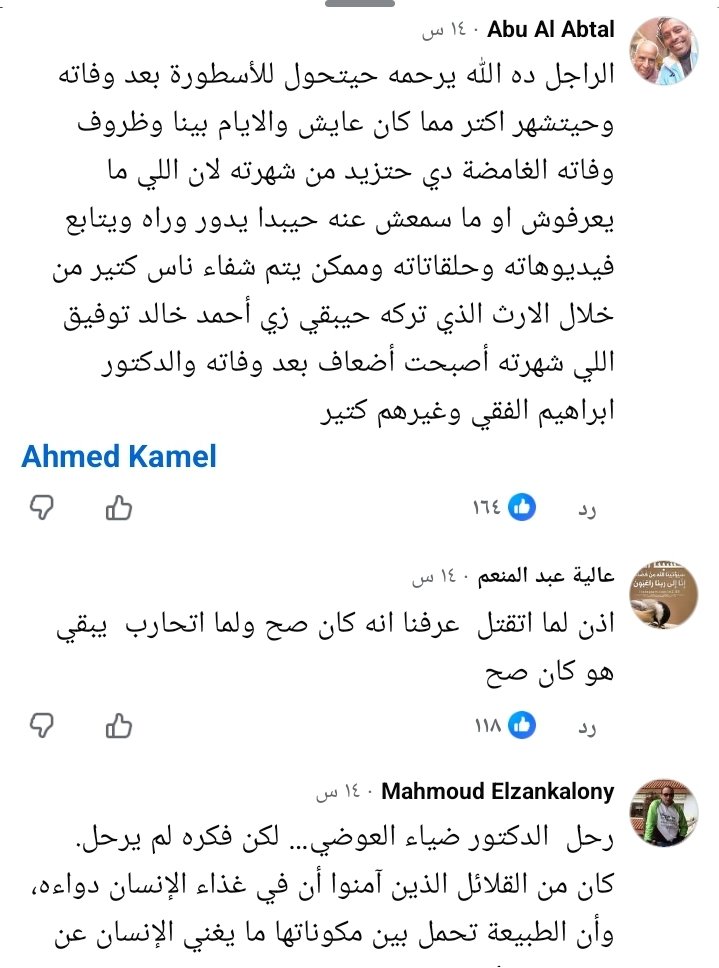 وبين الإشادة والانتقاد، تتلخص قصة الدكتور ضياء العوضي في كونه نموذجًا لشخصية أثارت الجدل في حياتها واستمر الجدل بعدها، فبينما يراه البعض صاحب علم نافع، يراه آخرون تجربة مثيرة للجدل تحتاج إلى مراجعة علمية دقيقة، ليبقى الحكم النهائي مرهونًا بوعي المتلقي وقدرته على التمييز بين الرأي والمعلومة العلمية.